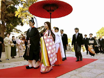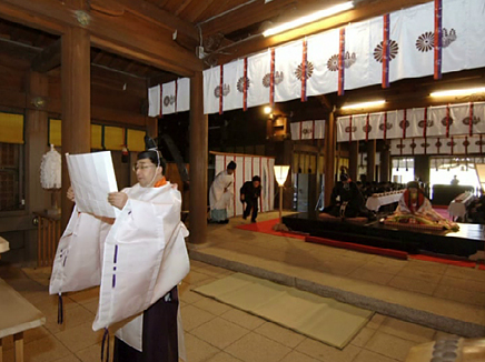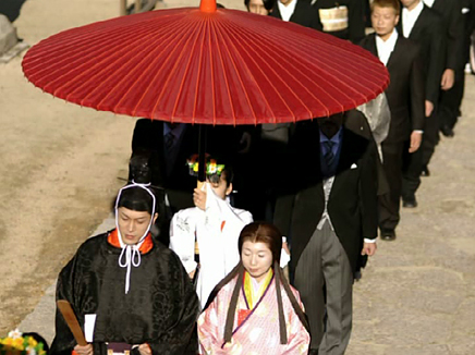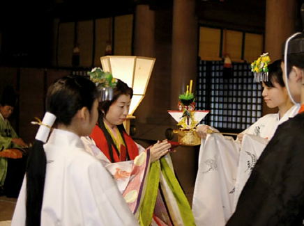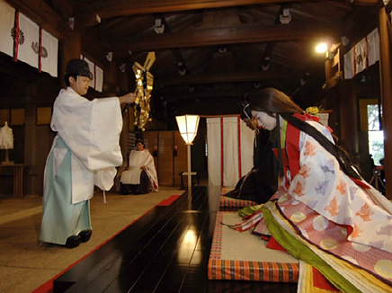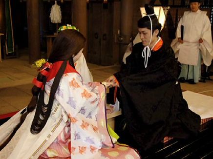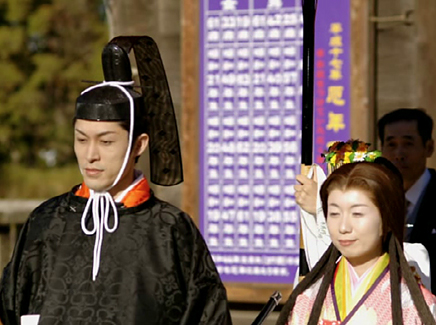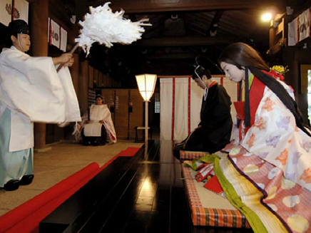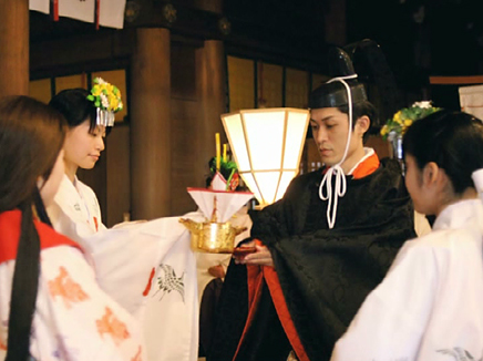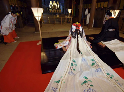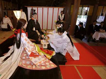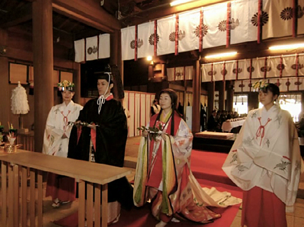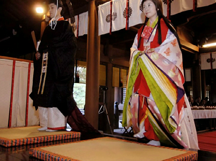 1.控えの間より随神門に向かい、列次をなして神殿に向かいます。 2.手水の儀 3.十二単の装束を整え心静かに神前に進みます。 4.清めのお祓いをします。 5.宮司と共に一拝し、宮司が祝詞を奏上します。 6.ご新郎様から御神酒を戴きます。 7.松・竹・梅、三種の盃を交わします。 8.指輪の交換をします。 9.誓いの言葉を奏上します。 10.奉納舞 11.御親族も一緒に盃を交わします。 12.宮司と共に一拝をし、挙式を結びます。 Facebooktwitter